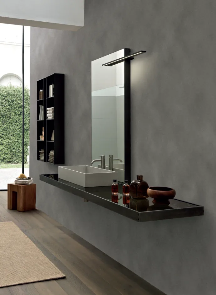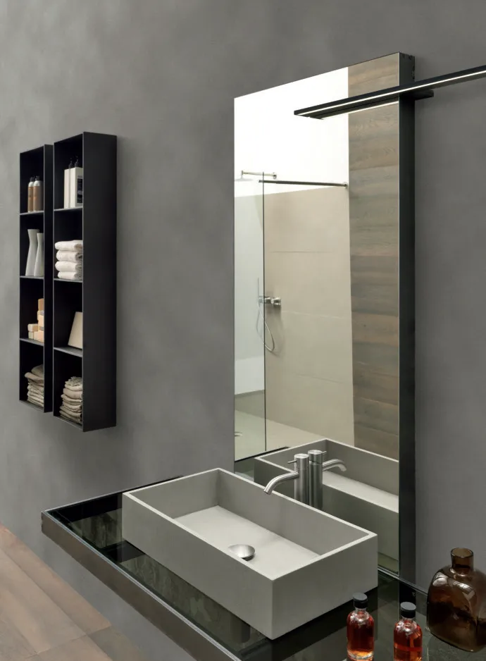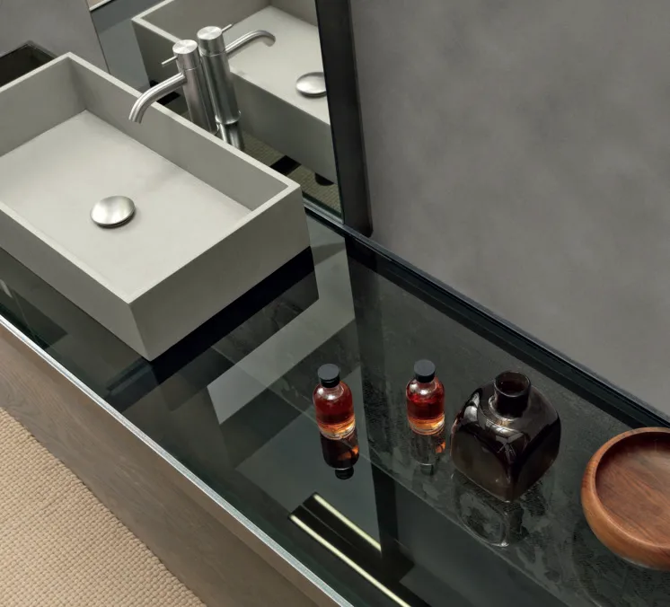 текстурные и цветовые эффекты подчеркивают яркость изысканной коллекции: раковина Square из керамогранита с эффектом смолы гармонирует с легкостью дымчатой стеклянной столешницы.