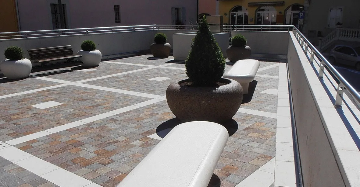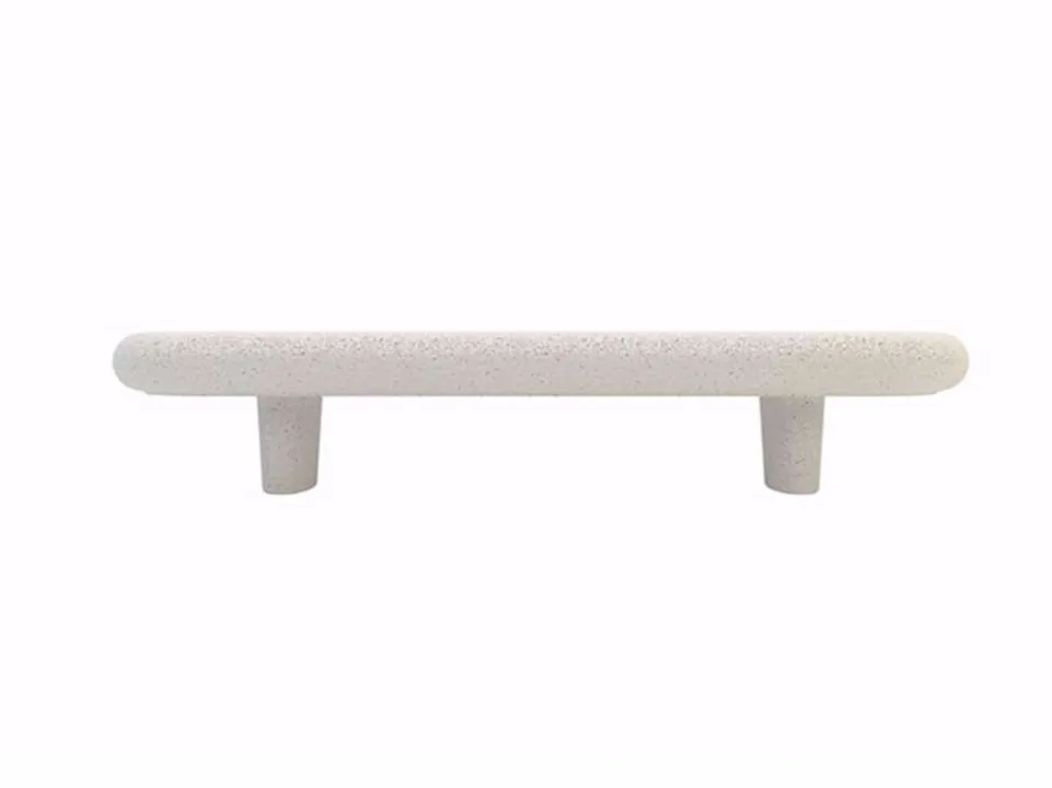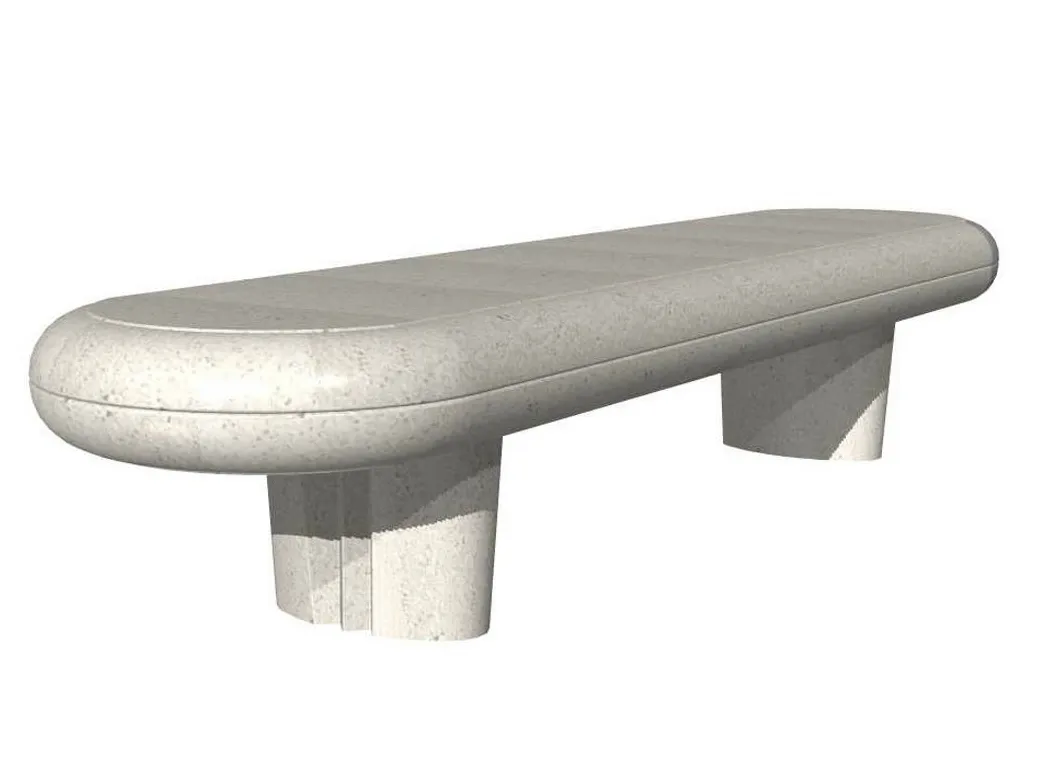 скамьяАфродита линейная и монолитная, прямоугольной формы с изогнутыми концами и опорными ножками, из белого, серого бетона или конгломерата мраморных камней.