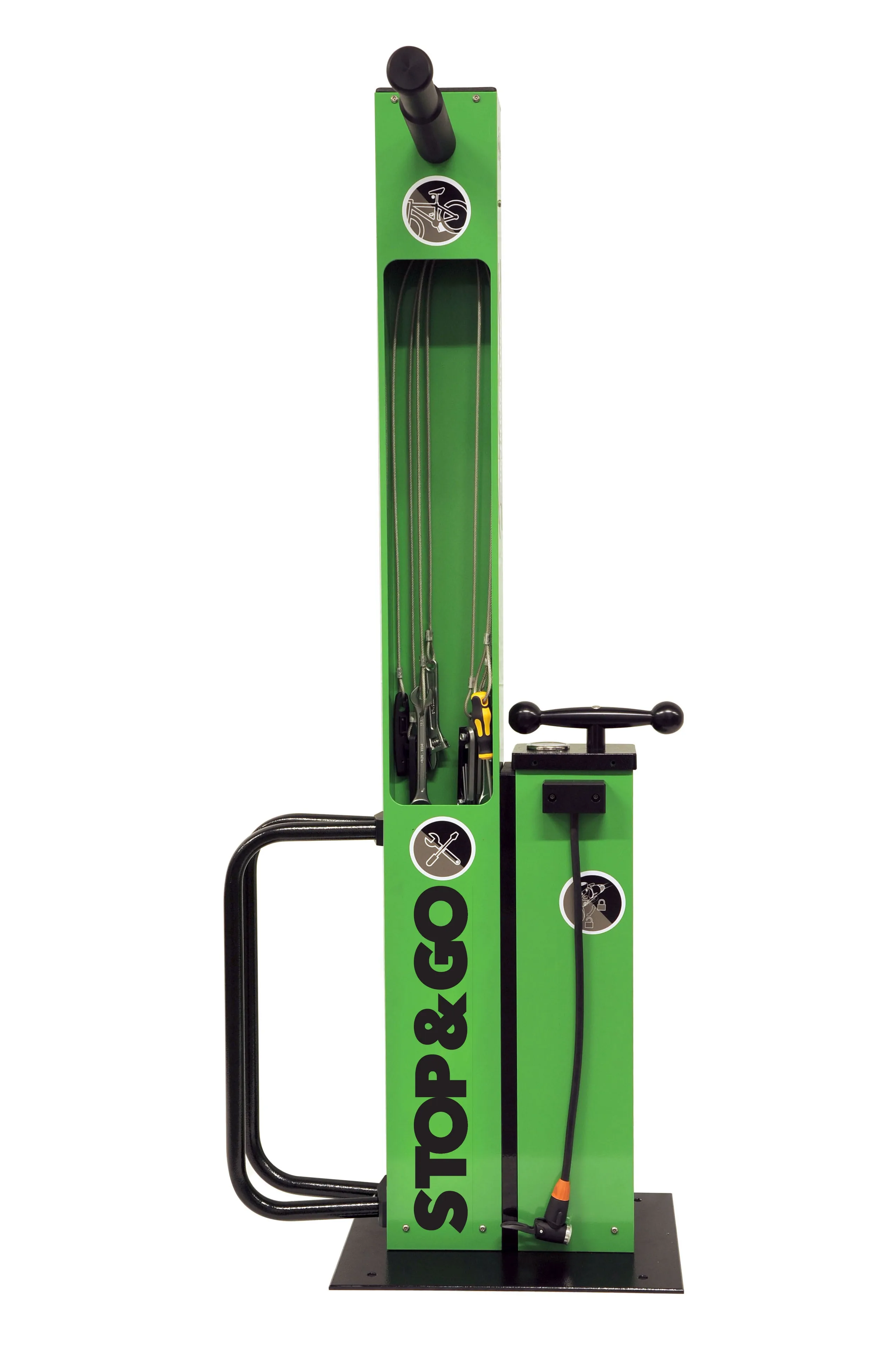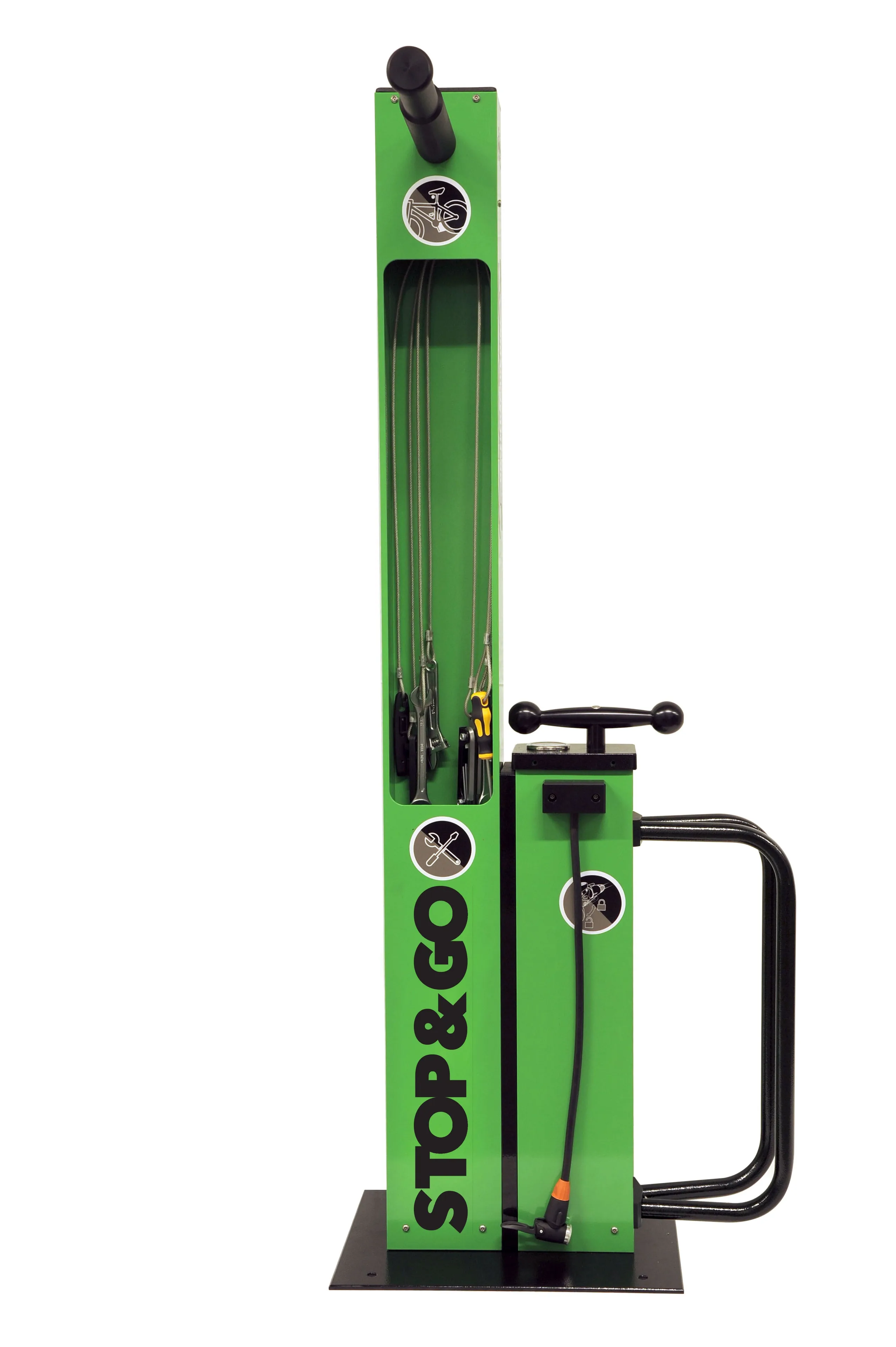 Stop&Go с велосипедной стойкой - это стойка для обслуживания велосипеда. Оснащен инструментами для технического обслуживания и универсальным насосом для накачивания шин. 1 или 2 боковые стойки для велосипедов.