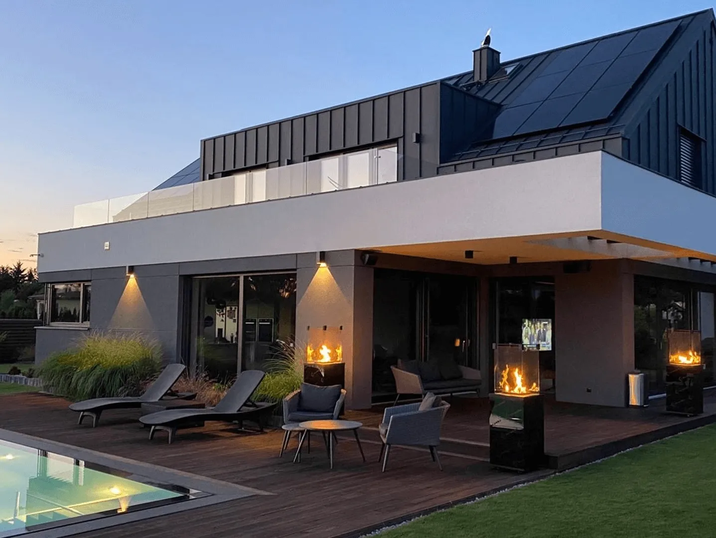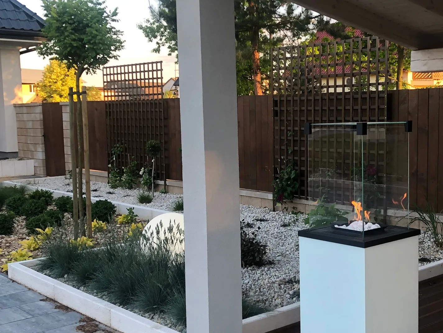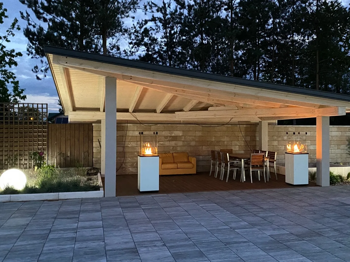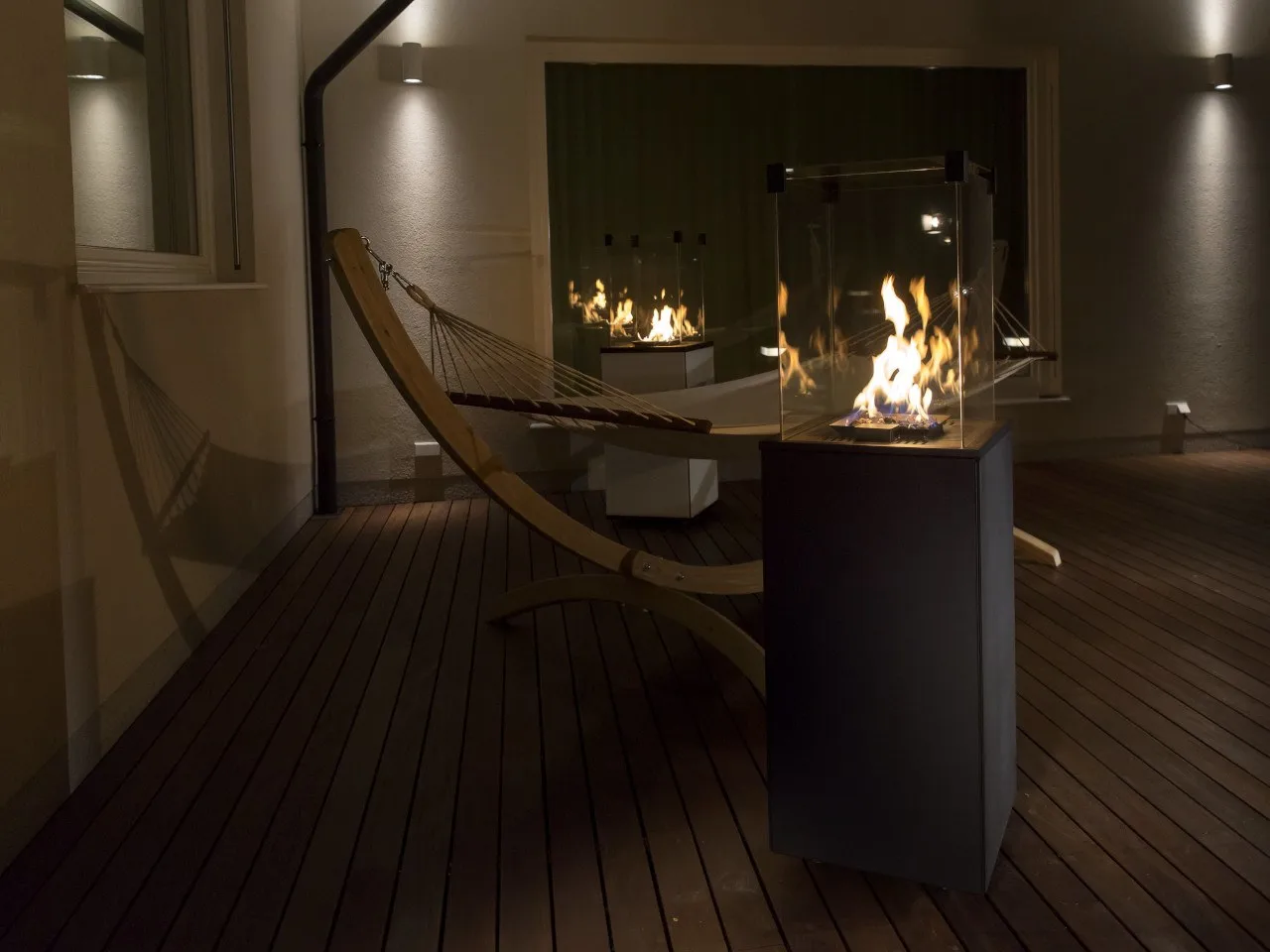 патио это открытый газовый обогреватель, который обеспечивает тепло и свет везде, где вы хотите создать уникальную и уютную атмосферу. Его уникальная особенность - огонь, видимый с четырех сторон. Благодаря этому это уникальный газовый патио или садовый светильник. Он может работать на полной мощности, непрерывно до 30 часов. Готовый к подключению, он имеет все элементы, необходимые для начала работы. Все, что вам нужно, это газовый баллон. Нижняя часть газового нагревателя патио он отделан на выбор: черная сталь с порошковым покрытием, черные стеклянные панели, белые стеклянные панели или стеганые черные стеклянные панели.