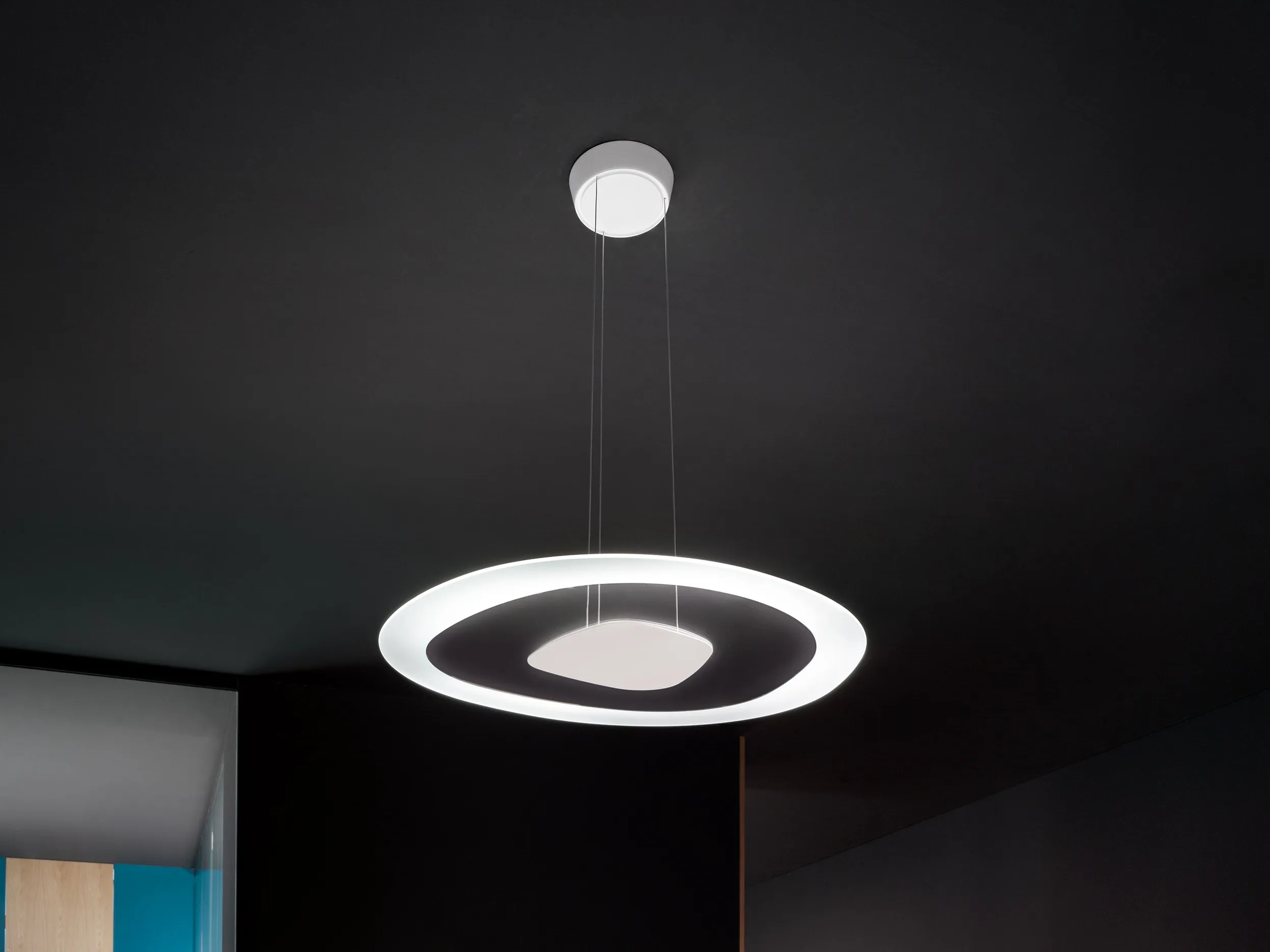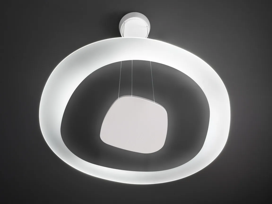 подвесной или потолочный светильник с неровными краями, который распределяет удобный светодиодный свет по всей комнате дома. Стеклянный диффузор с пескоструйной обработкой, центральный элемент из окрашенного в белый цвет металла.