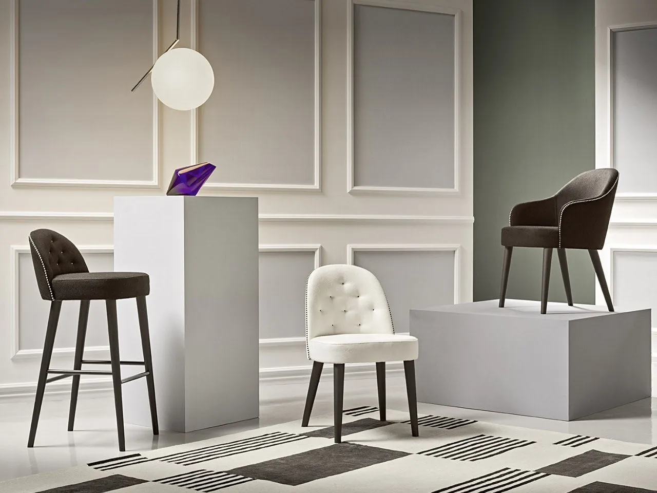 Carmen это система, которая включает в себя стулья, кресла, диваны, барные стулья, характеризующиеся сочетанием функциональности и эстетики. Тонкие деревянные ножки придают исключительную легкость и универсальность. Форма спинки уютная и удобная, вдохновленная классицизмом, но с ноткой, напоминающей современность 60-х годов. с простой структурой из бука и широким спектром решений, сочетающих тканевую или кожаную обивку и отделку древесины ноги, Carmen адаптируется к любой среде и проекту интерьера: отели, ...