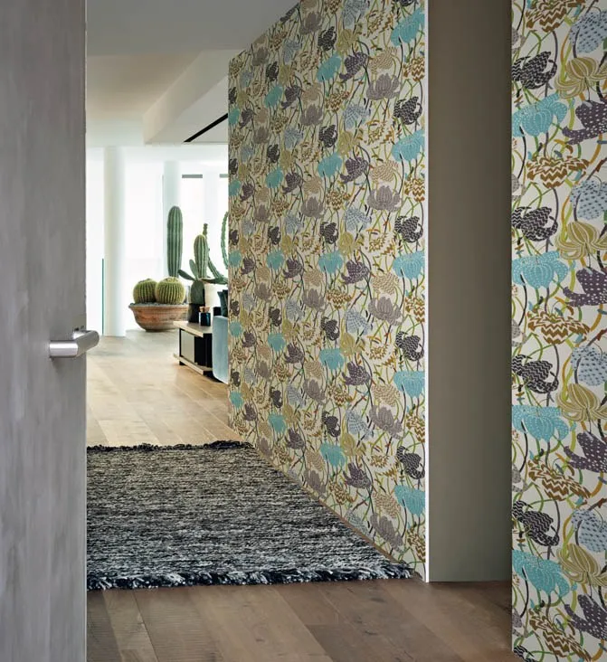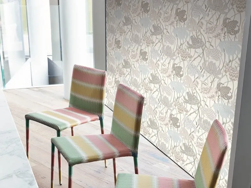 главный герой ' MissoniHome Wallcoverings03’ это фирменная цветовая палитра бренда, которая подчеркивает сочетание классического и Moderna вкуса коллекции. Две души, сильно обозначенные выбором весенних и зимних тонов, которые контрастируют и усиливают друг друга, также усиливаются методами тиснения, одна более деревенская, а другая более изысканная, с тонкой отделкой точилкой в тонких филигранных эффектах, которые придают материальность обоям.