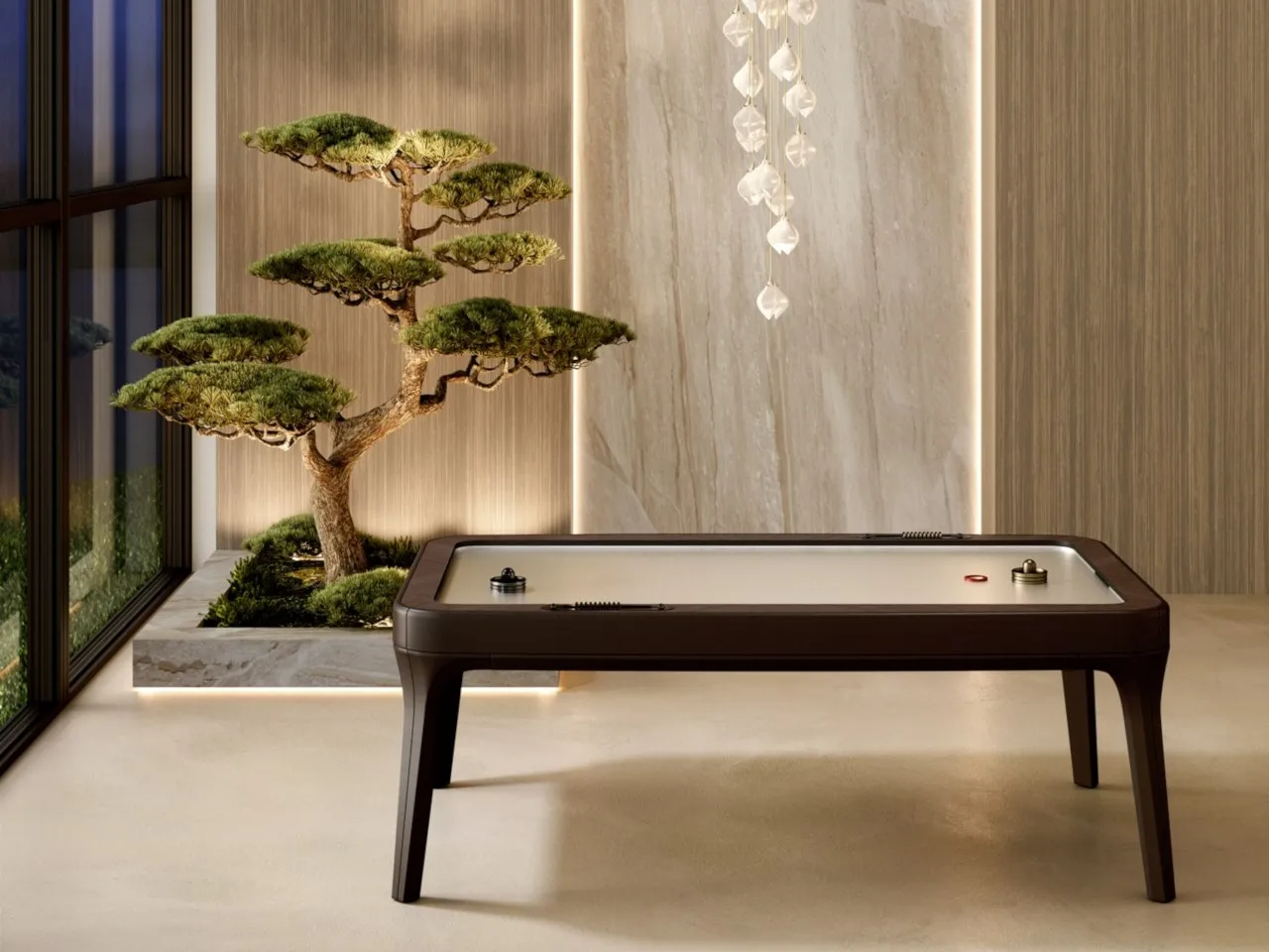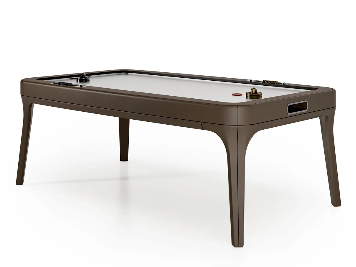 игровое поле металлическое ламинат с проколами, обеспечивающими достаточный поток воздуха. Вся структура полностью покрыта кожей. Верхняя часть берегов выполнена из ореха Каналетто или черного дерева Макассар.