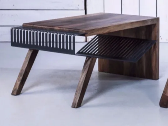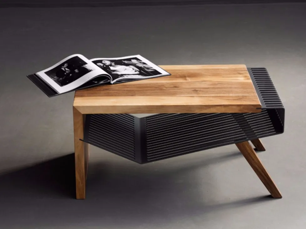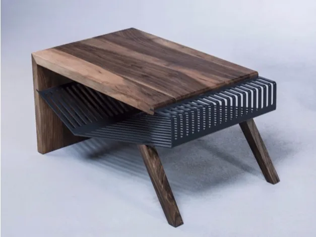 журнальный столикPolyline изготовлен из комбинации массива дерева и перфорированной и профилированной стали толщиной 3 мм, гофрированной в деревянную конструкцию. Сталь, которая складывается по-разному, делает все элементы этой коллекции статичными, эстетичными и функциональными, а также части этого стола. Название коллекции Polyline происходит от игривости форм линий стали на боковых краях.