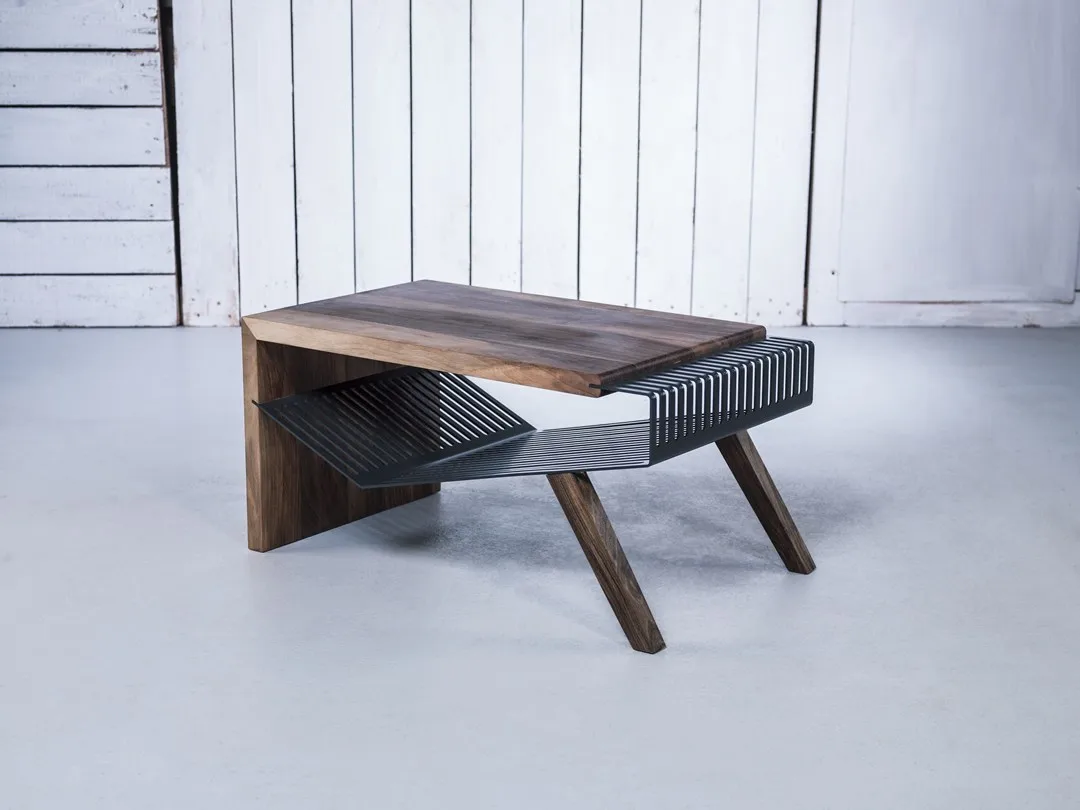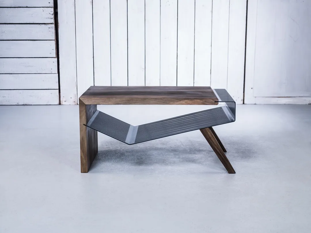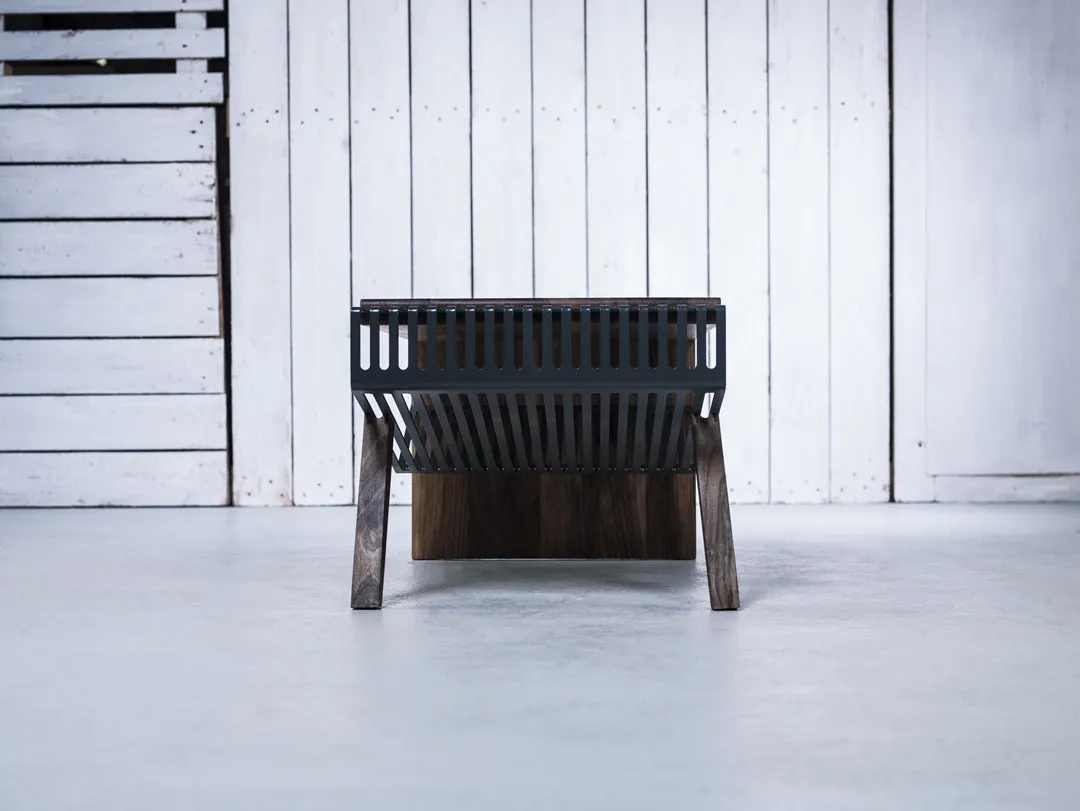 вы можете выбрать тип дерева и цвет стали на каждом отдельном куске, чтобы клиенты могли настроить внешний вид своего кусок. Сочетание европейского ореха и антрацита из окрашенной в серый цвет стали - одно из гармоничных сочетаний для этой мебели.