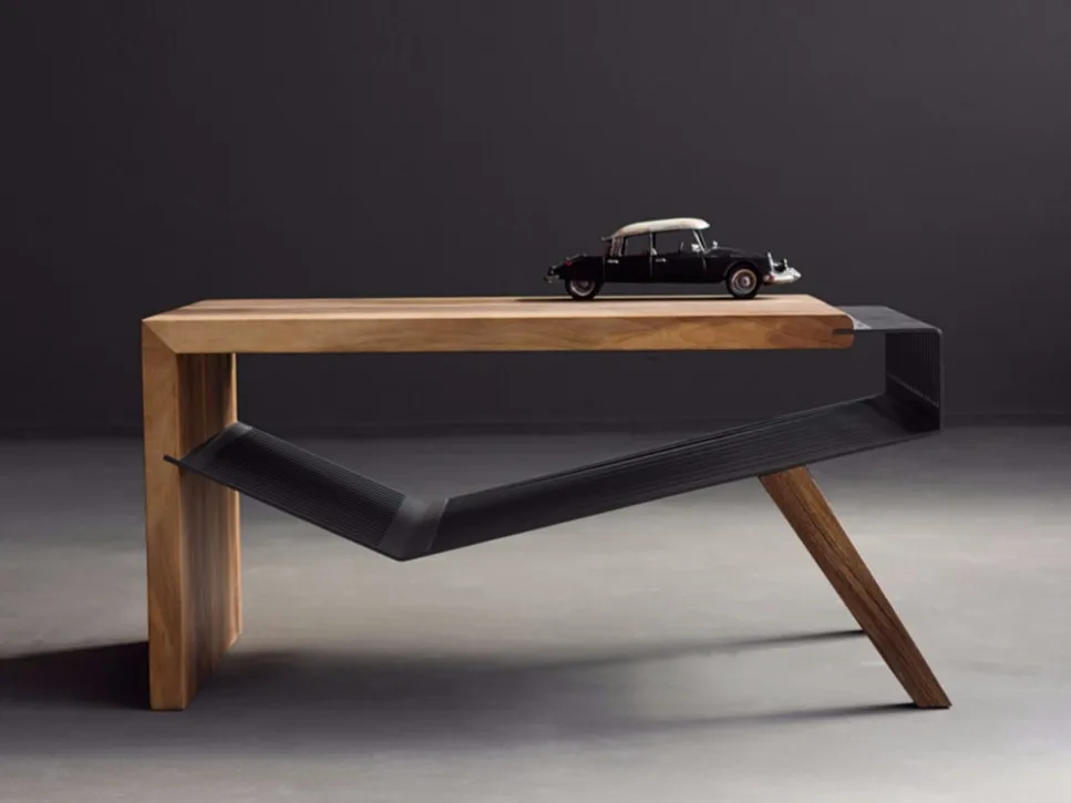 этот асимметричный стол имеет деревянную панель с одной стороны, а опора с другой стороны состоит из двух клиновидных деревянных ножек, вставленных в стальные направляющие, выходящие из перфорированной многоугольной стали.